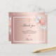 An elegant thank you card with photo. A rose gold faux metallic looking background, a white frame, rose gold roses, florals. A golden cross. Personalize and add a thank you note, photo of the baby girl and name. Black text.