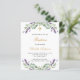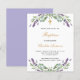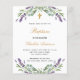 A white background decorated with lavender flowers and eucalyptus greenery. Personalize and a name and ceremony details. Black and golden colored letters.