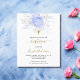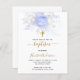 For an elegant baptism, celebrating a baby boy. A chic white background. Decorated with light blue and white florals, roses and a faux gold cross. Personalize and add the name of the child and details. Black and golden letters.