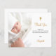 A white and faux gold minimalist baptism thank you card. Personalize and add your photo of the child, thank you note and name. Gender neutral.