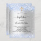 For an elegant and baptism invitation. A faux silver metallic looking background. Decorated with light blue faux glitter and a golden cross. Personalize and add a name and details. Modern hand lettered style script