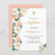 A trendy floral baptism invitation in white, pink and rose gold . A chic white background on the front. Decorated with large, lush watercolored flowers, florals . Personalize and add the name of the child and ceremony detail. Black and golden colored text.