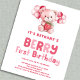 Budget Berry First Birthday Strawberry 1st Party. A budget price smaller 4.5 x 5.6” 110lbs semi-gloss, similar in thickness to a postcard. There is ONE per sheet. Berry First Birthday is in a set modern script. Easily personalise the rest of the words as required. With a cute teddy bear, strawberry and balloons illustration.