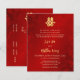 This version has a headline to announce the wedding by the parents of the bride and groom. This elegant Chinese wedding invitation features an artistic gold double happiness symbol on a floral ruby red shimmering background. Bride and groom names in an elegant handwritten script. Chinese wedding invitation or tea ceremony invitation.