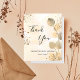 A thank you card for a 50th (or any age) birthday. A golden watercolored background decorated with golden eucalyptus and faux gold glitter dust. On front large black colored hand lettered script and the text: Thank You, your text, title and a date.