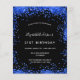 A girly and feminine 21st (or any age) birthday party invitation. On front: A chic black background. Decorated with royal blue faux glitter dust. Personalize and add a name and party details. The name is written with a hand lettered style script.