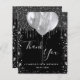 A thank you card for a 18th (or any age) birthday. A chic black background color. With faux silver glitter drips, paint dripping look and balloons. On front large hand lettered script and the text: Thank You, your text, title and a date.