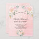 A blush pink background decorated with small golden sparkles, dots and a golden cross. Pink, white florals and eucalyptus greenery. Personalize and add a name and party details. Black colored letters. Elegant script