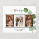 Add 3 of Your birthday photos, vertical size, a date, name, and the thank you note. A chic white background with black text and frame, a eucalyptus sprig. The text: Thank you on the front and your name on the back are written with a stylish hand lettered script with swashes.