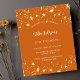 A burnt orange background decorated with golden stars. Personalize and add a name and party details. The name is written with a hand lettered style script, white colored letters.