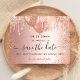A girly and trendy Save the Date card for a 18th (or any age) birthday party. A blush, rose gold gradient background decorated with faux glitter drips, sparkles, and balloons. Personalize and add a date and name/age. The text: Save the Date is written with a large trendy hand lettered style script.