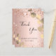 A thank you card for a 50th (or any age) birthday. A rose gold faux metallic looking background, decorated with faux glitter sparkles and golden eucalyptus. On front, a large hand lettered script and the text: Thank You, your text, title and a date.