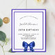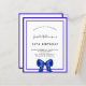 A modern, elegant and invitation. A white background decorated with royal blue frames and a bow. Personalize and add a name and details. Black colored letters.