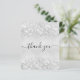 A feminine and elegant birthday thank you card. A faux silver metallic looking background color. With faux glitter dust. On front large hand lettered script and the text: Thank You.