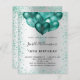 For an elegant 18th (or any age) birthday. A faux silver metallic looking background. Decorated with teal faux glitter dust and balloons. Personalize and add a name, age and party details. The name is written with a hand lettered style script