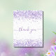 A feminine and elegant birthday thank you card. A chic white background. With purple, violet faux glitter dust. On front large hand lettered script and the text: Thank You.