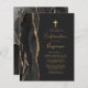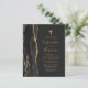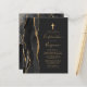 The left-hand edge of this elegant modern Confirmation invitation features a black watercolor agate border trimmed with faux gold glitter. A faux gold foil cross appears above the customizable text, which combines gold-colored handwriting, copperplate and italic fonts on a slate black background. The reverse side features a matching black and gold agate design.