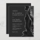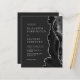 The right edge of this elegant modern wedding invitation features a black watercolor agate border trimmed with faux silver glitter. The customizable text combines silver gray serif, copperplate and italic fonts on a slate black background. The reverse side provides space for wedding details on a solid slate black background, along with a QR code guests can scan to visit your website and RSVP, which saves the cost of printing and mailing separate RSVP cards.