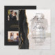 This elegant wedding design features a vertical photo of the couple softened with a white screen to highlight the text overlay. The left-hand edge features a black watercolor agate border trimmed with faux gold glitter. The customizable black text combines handwriting, copperplate and italic fonts. The reverse side provides spaces for 4 photos (1 square, 2 horizontal, 1 long vertical) and room for your wedding website URL or other information. NOTE: Envelopes are not automatically included with these budget invitations, so please remember to choose the "blank white envelopes" option!