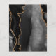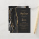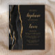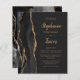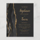 The left-hand edge of this elegant modern wedding invitation features a black watercolor agate border trimmed with faux gold glitter. The customizable text combines gold-colored calligraphy brush script and sans serif fonts on a slate black background. The reverse side features a matching black and gold agate design.