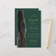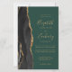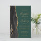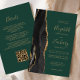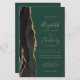 The left-hand edge of this elegant modern wedding invitation features a black watercolor agate border trimmed with faux gold glitter. The customizable text combines gold-colored handwriting, copperplate and italic fonts on an emerald green background. Add additional details on the back, along with a QR code to help your guests visit your wedding website.