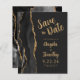 The left-hand edge of this elegant modern wedding save the date card features a black watercolor agate border trimmed with faux gold glitter. The customizable text combines gold-colored modern script and sans serif fonts on a slate black background. The reverse side features a matching black and gold agate design.