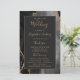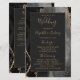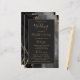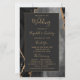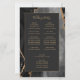 This elegant, modern wedding program features a black agate background trimmed with gold faux glitter. The text appears in elegant gold colored handwriting and copperplate fonts on an off-black rectangle.