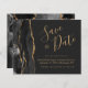 This elegant budget save the date card features a black watercolor agate border trimmed with faux gold glitter. The customizable text combines gold colored handwriting script, copperplate and italic fonts on a charcoal gray background. The reverse side features a matching black and gold agate design.