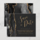 This elegant budget save the date card features a black watercolor agate border trimmed with faux gold glitter. The customizable text combines gold colored handwriting script, copperplate and italic fonts on a charcoal gray background. The reverse side features a matching black and gold agate design. NOTE: Envelopes are not automatically included with these budget invitations, so please remember to choose the "blank white envelopes" option!