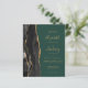 The left-hand edge of this elegant modern wedding invitation features a black watercolor agate border trimmed with faux gold glitter. The customizable text combines gold-colored handwriting, copperplate and italic fonts on an emerald green background. The reverse side provides space for wedding details, along with a QR code guests can scan to visit your website and RSVP, which saves the cost of printing and mailing separate RSVP cards.