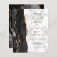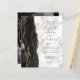 The left-hand edge of this elegant modern wedding invitation features a black watercolor agate border trimmed with faux gold glitter. The customizable text combines gold-colored handwriting script with black copperplate and italic fonts on a gray and white marble background. The reverse side features a matching black and gold agate design.