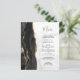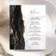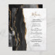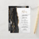 The left-hand edge of this elegant modern wedding menu features a black watercolor agate border trimmed with faux gold glitter. The customizable text combines gold-colored handwriting script and black copperplate font on a white and gray marble background. The reverse side features a matching black and gold agate design.
