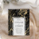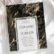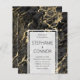 These elegant wedding invitations feature a black and gold marble background. The text appears in simple, modern black sans serif font on a semitransparent white rectangle aligned with the bottom of the card. The marble design also appears on the reverse.