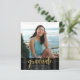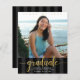 Be proud, rejoice and announce to the world that your favorite grad has reached their milestone with this stunning, simple, modern, personalized budget announcement invite. Sparkly, elegant, faux gold glitter calligraphy script, white sans serif typography and a photo of your choice overlay a black and dark gray striped background. Personalize the custom text with your graduate’s name, school name, class year, and graduation date. On the back, add your personal note, next school they’re attending, party information, etc. Guaranteed to add stylish fun to their special occasion!