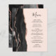 The left-hand edge of this elegant modern wedding invitation features a black watercolor agate border trimmed with faux rose gold glitter. The customizable text combines slate black handwriting script and copperplate fonts on a blush pink background. The reverse side features a matching black and rose gold agate design.