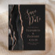 The left-hand edge of this elegant modern wedding save the date card features a black watercolor agate border trimmed with faux rose gold glitter. The customizable text combines rose handwriting, copperplate and italic fonts on a dark charcoal gray background. The reverse side features a matching black and rose gold agate design.