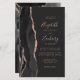 The left-hand edge of this elegant modern wedding invitation features a black watercolor agate border trimmed with faux rose gold glitter. The customizable text combines rose handwriting, copperplate and italic fonts on a dark charcoal gray background. The agate design is repeated on the back of the card.