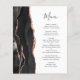 The left-hand edge of this elegant modern wedding menu features a black watercolor agate border trimmed with faux rose gold glitter. The customizable text combines charcoal gray handwriting script and copperplate fonts on a white background. The reverse side features a matching black and rose gold agate design.