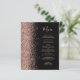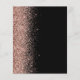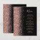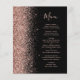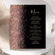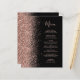 The left-hand edge of this elegant modern wedding menu features a rose gold faux glitter border. The customizable text combines rose pink whimsical handwriting script and copperplate fonts on a black background. The reverse side features a matching black and rose gold glitter design.