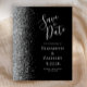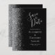 The left-hand edge of this elegant modern wedding save the date card features a silver faux glitter border. The customizable text combines silver gray handwriting, copperplate and italic fonts on a black background. The reverse side features a matching black and silver design.