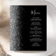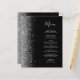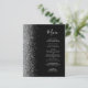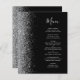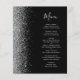 The left-hand edge of this elegant modern wedding menu features a silver faux glitter border. The customizable text combines silver gray handwriting script and copperplate fonts on a black background. The reverse side features a matching black and silver design.