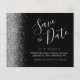This elegant budget save the date card features a silver faux glitter border. The customizable text combines silver gray handwriting script, copperplate and italic fonts on a black background. The reverse side features a matching black and silver design.