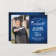 A budget-friendly, modern blue and white graduation announcement printed on 4.5x5.6-inch lightweight paper instead of cardstock personalized with your graduate's photo, name, class year and school name and/or degree (or change the text to your custom message) with the title CONGRATULATIONS TO OUR GRADUATE in modern, hand lettered brush stroke typography accented with a graduation cap or mortarboard against a two-toned brushed metallic blue background. Ideal for conservative budgets and/or hand delivering. ASSISTANCE: For help with design modification or personalization, color change, resizing or transferring the design to another product, contact the designer BEFORE ORDERING via the Zazzle Chat MESSAGE tab or email makeitaboutyoustore@gmail.com.