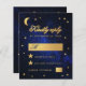 A budget wedding RSVP for a celestial wedding theme, with the moon and star on a starry night blue background. The words "Kindly reply" and the letter M are written in an elegant calligraphic script. The moon and the places to fill are faux gold foil, the places for accepting and declining are faux gold stars. On the black, there is only the moon and star on a starry night blue background.