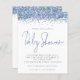 A value for money BUDGET alternative on a smaller size 4.5 x 5.6” semi-gloss 110lbs weight, which is of similar thickness to a postcard (however is not suitable to use as a postcard.). PLEASE NOTE there is ONE invite per sheet. Budget Blue Glitter Baby Shower Invitation. A touch of sparkle to celebrate the mom to be with a faux glitter border at the top on both sides and occasion header in a set informal script. Easily personalise the rest of the text to your own details.
