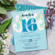 “Happy Sweet 16”. Send out this stunning, simple, festive, modern, personalized budget party invitation for an event to remember. Bold, graphic, deep teal blue typography and handwritten script overlay a teal blue glitter “16”, aqua green blue balloons and gold sparkly string lights on a soft light aqua blue background. Personalize the custom text with your daughter’s name as well as other party details. Great for the budding fashionista who loves modern glitter and glam and guaranteed to add stylish fun to her special party!