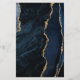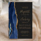 The left-hand edge of this elegant modern wedding invitation features a navy blue watercolor agate border trimmed with faux gold glitter. The customizable text combines gold colored handwriting, copperplate and italic fonts on an off-black background. The reverse side features a matching navy blue and gold agate design.