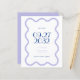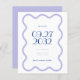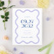 This wedding save the date card is feature a wavy border. It uses calm colors like lavender inspired by lavender fields. The fun and stylish fonts add a touch of elegance, and word at the center are highlighted in bright blue for a fun pop of color and uses a bigger font size.