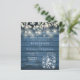 A stylish budget wedding invitation featuring pretty string lights, mason jars and sage and lilac leaves that tumble over a blue rustic wood background. Designed by Thisisnotme©