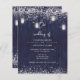 Budget, blue rustic mason jar wedding invitation with string lights.
